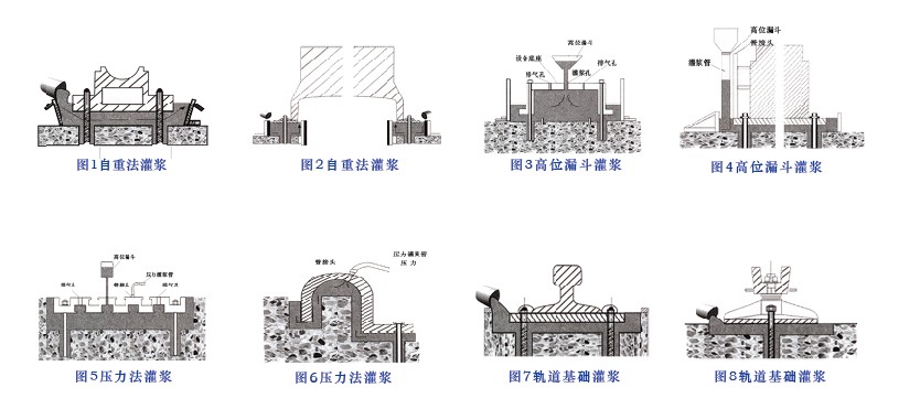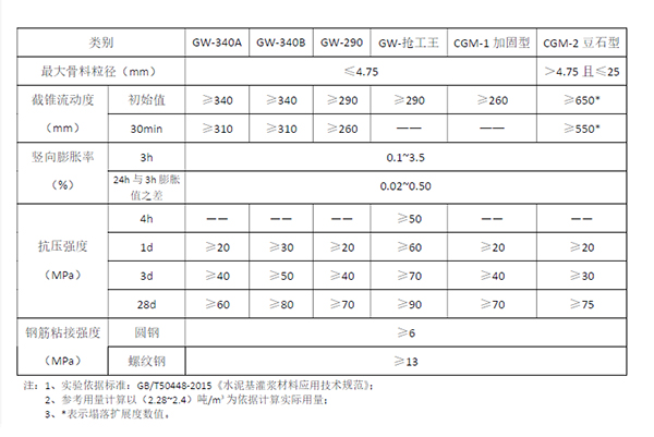 1天抗压强度≥20Mpa;3天抗压强度≥40Mpa;28天抗压强度≥65Mpa。 2、微膨胀性 保证设备与基础之间紧密接触, 二次灌浆后无收缩。 3、自流性高 可填充全部空隙,满足设备二次灌浆的要求。 4、耐久性强 经上百万次疲劳试验50次冻融循环实验强度无明显变化。在机油中浸泡30天后强度明显提高。 5、可冬季施工 允许在-10℃气温下进行室外施工。 水泥基灌浆料的用途: 1、用于设备基础二次灌浆。 2、用于地脚螺栓锚固及钢筋栽埋。 3、用于混凝土结构加固和修补。 4、用于梁柱截面增大加固工程。 CGM灌浆料的执行标准:GB/T50448-2015 灌浆料技术参数 灌浆具体型号的选择依据: 灌浆施工前的准备 1、机器搅拌:混凝土搅拌机或砂浆搅拌机。 2、人工搅拌:搅拌槽及铁铲若干。 3、水桶若干。 4、台秤若干。 5、拌槽。 6、高位漏斗、灌浆管及管接头。 7、灌浆助推器。 8、模板(钢模、木模)。 9、草袋、岩棉被等。 10、棉纱、胶带。 灌浆料施工顺序 第一步:基础处理 1、基础表面应进行凿毛处理,或采用专用加固界面剂J-302混凝土再浇剂做界面处理。 2、清洁基础表面,不得有碎石、浮浆、浮灰、油污和脱模剂等杂物。 3、灌浆前24h,基础表面应充分湿润,灌浆前1h,清除积水。 第二步:支模 1、按灌浆施工图支设模板。模板与基础、模板与模板间的接缝处用水泥浆( 推荐901快速堵漏剂)、胶带等封缝,达到整体模板不漏水的程度。 2、模板与设备底座四周的水平距离应控制在100mm左右,以利于灌浆施工。 3、模板顶部标高应高出设备底座上表面50mm。 4、灌浆中如出现跑浆现象,应及时处理。 第三步:灌浆料配制 1、一般通用加固型按13-15%的标准加水搅拌,豆石加固型按9-11%的标准加水搅拌。 2、推荐采用机械搅拌方式,搅拌时间一般为1-2min(严禁用手电钻式搅拌器)。采用人工搅拌时,应先加入2/3的用水量拌和2min,其后加入剩余水量搅拌至均匀。 3、每次搅拌量应视使用量多少而定,以保证40min以内将料用完。 4、现场使用时,严禁在灌浆料中掺入任何外加剂、外掺料。 第四步:灌浆施工方法 1、较长设备或轨道基础,应采用分段施工。 2、几种常用灌浆方式图示: 3、二次灌浆时,应符合下列要求。 ① 二次灌浆时,应从一侧或相邻的两侧多点进行灌浆,直至从另一侧溢出为止,以利于灌浆过程中的排气。不得从四侧同时进行灌浆。 ② 灌浆开始后,必须连续进行,不能间断。并尽可能缩短灌浆时间。 ③ 在灌浆过程中严禁振捣。必要时可用灌浆助推器沿灌浆层底部推动灌浆料,严禁从灌浆层中、上部推动,以确保灌浆层的匀质性。 ④、设备基础灌浆完毕后,应在灌浆后3-6h沿设备边缘向外切45度斜角以防止自由端产生裂缝 ,如无法进行切边处理,应在灌浆后3-6h后用抹刀将灌浆层表面压光。 ⑤、当灌浆层厚度超过150mm时,应采用豆石加固型高强无收缩灌浆料。 ⑥、当设备基础灌浆量较大时,豆石加固型灌浆料的搅拌应采用机械搅拌方式,以保证灌浆施工。 第五步:养护 1、灌浆完毕后30min内应立即加盖湿草帘或岩棉被,并保持湿润。 2、冬季施工时,养护措施还应符合现行<<钢筋混凝土工程施工及验收规范>>(GB50204)的有关规定。 3、灌浆料达到拆膜时间后,可进行设备安装,具体时间参见“拆膜和养护时间及环境温度的关系表” 4、在设备基础灌浆完毕后,如有要剔除部分,可在灌浆完毕后3-6h后,即灌浆层硬化前用抹刀或铁锨工具轻轻铲除。 5、不得将正在运转的机器的震动传给设备基础,在二次灌浆后应停机24-36h,以免损坏未结硬的灌浆层。 灌浆料的包装储运 1、包装规格:50kg±0.5kg/袋,存放在通风干燥处并防止阳光直射。 2、保质期为6个月,超出保质期应复检合格后方可使用 。 3、不含有苯系物、卤代烃、甲醛、重金属等成分,无毒、无味、无污染、不燃不爆,可按一般货物运输。 郑重声明 本资料中所提供的数据是基于我公司现有的知识、经验和条件,我们所进行的试验不可能完全囊括所有使用过程中可能产生影响的大量因素。本产品使用超出厂商控制,本公司不承担由于使用不当而产生的任何责任,使用时敬请参照本品说明书,相关问题请咨询当地经销商或本公司技术服务部门。