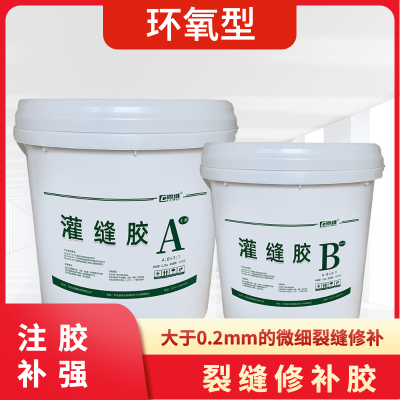 按质量比A:B为3:1分别取适量的A、B组分于提前准备好混胶容器中,人工或者机器搅拌均匀。用自动压力灌浆器吸入树脂胶旋紧于底座上,松开拉手进行注胶,可反复多次注胶,直至注满裂缝。